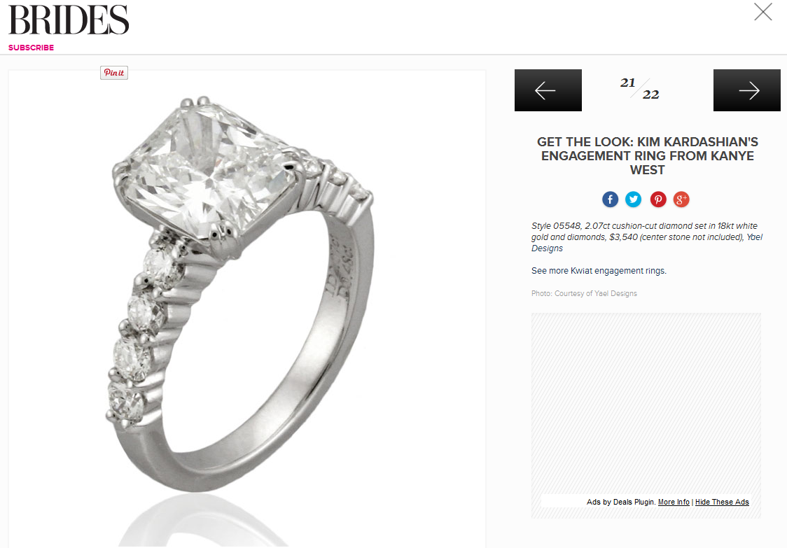 Brides featured Yael Designs Published November 19, 2013 at 1124 × 783 in Clients in the news Brides featured Kim Kardashian look-alike ring by Yael Designs. November 2013