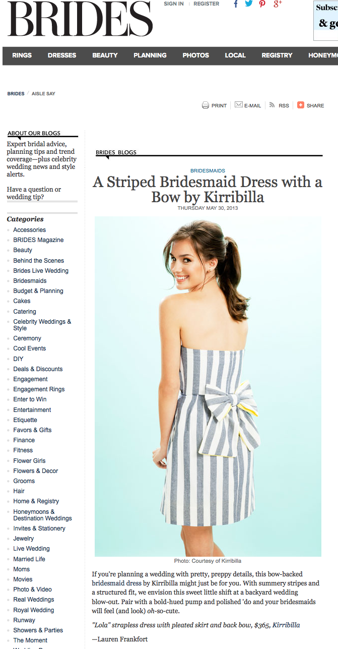 2013_5_Brides Published June 3, 2013 at 671 × 1287 in Clients in the news Striped Kirribilla bridesmaid dress with a bow featured in Brides May 2013