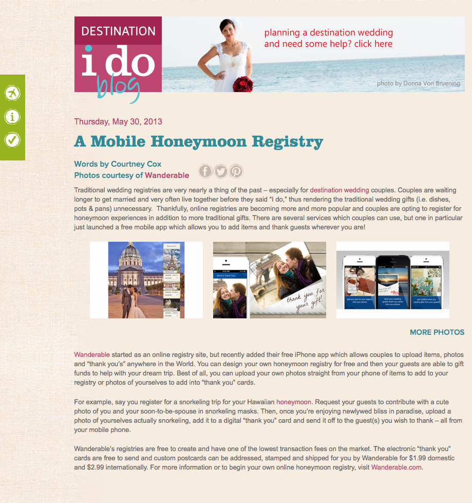 2013_5_DestinationIDo Published June 3, 2013 at 919 × 978 in Clients in the news Destination I Do Magazine features honeymoon registry and mobile app by Wanderable May 2013