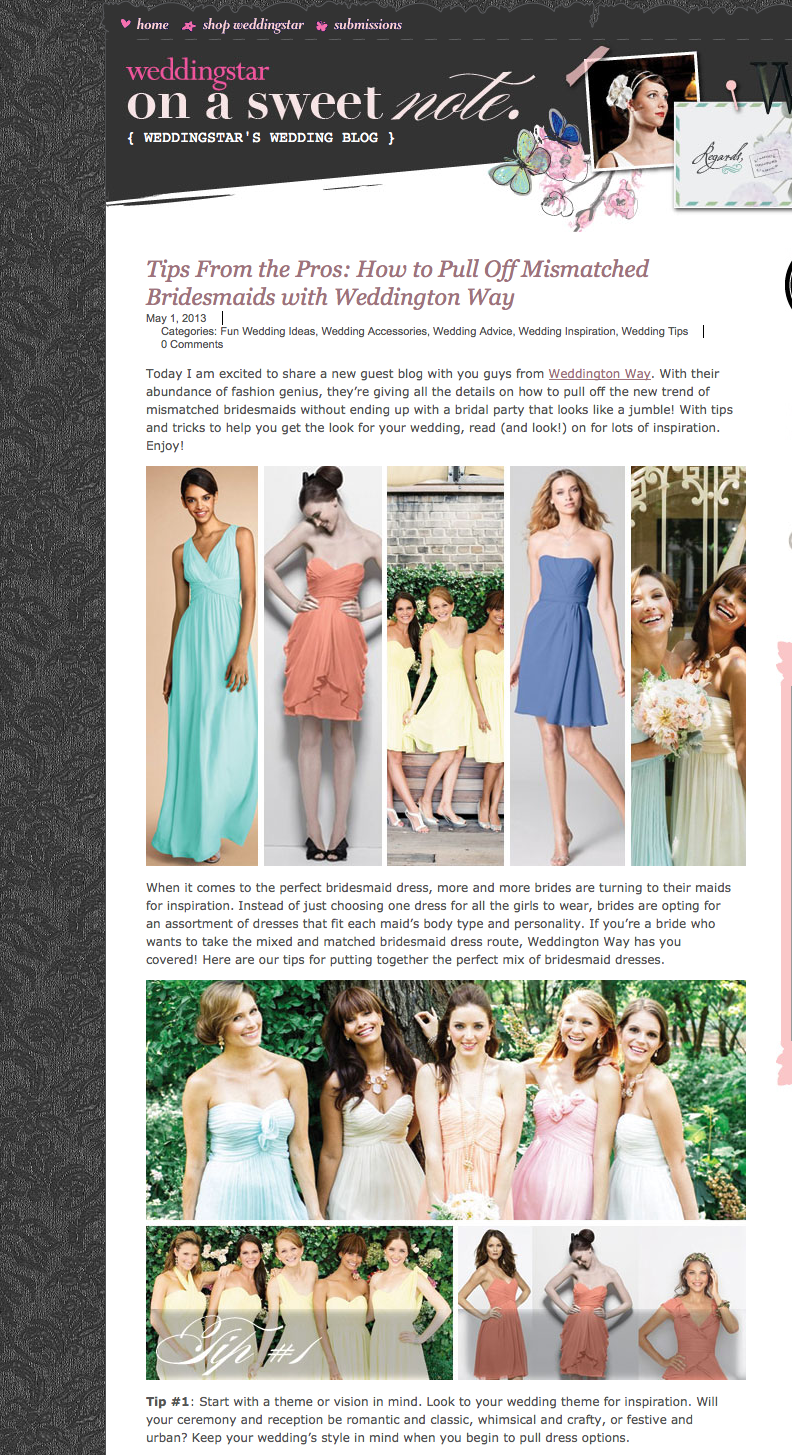 2013_5_Weddingstar Published May 23, 2013 at 792 × 1455 in Clients in the news Weddingstar features mismatched bridesmaids dresses by Weddington Way May 2013